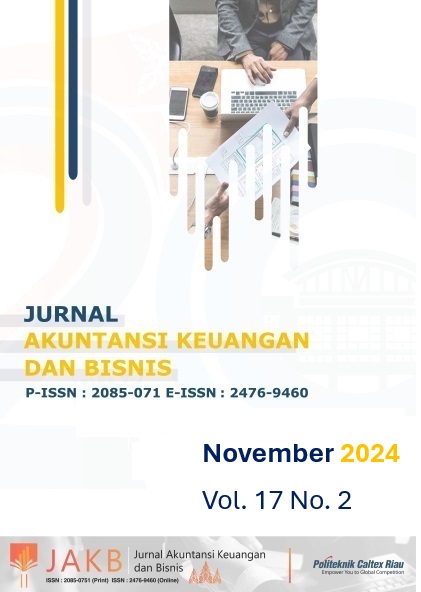 Jurnal Akuntansi Keuangan dan Bisnis (JAKB), with registered number ISSN 2476-9460 (Online) and ISSN 2085-0751 (Print) is a multidisciplinary scientific journal published by Politeknik Caltex Riau. JAKB provides a specialized forum for the publication of research in the area of financial economics and the theory of the firm, placing primary emphasis on the highest quality analytical, empirical, and clinical contributions in the following significant areas: Economic, Finance, Business, Banking, and Accounting. This journal published twice a year (May and November).